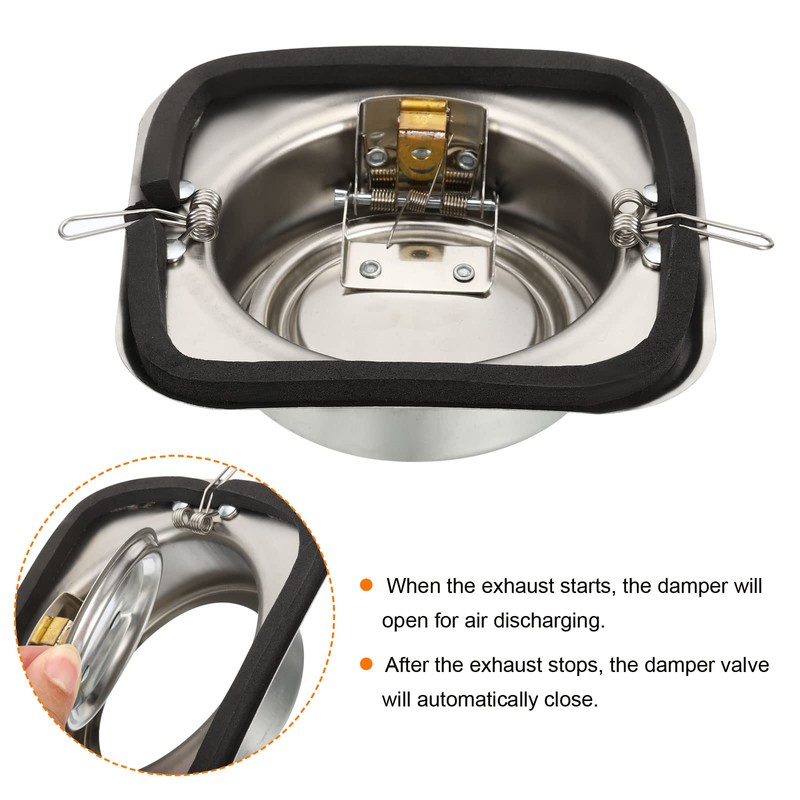 - Advantage: Made of durable 201 Stainless Steel, which has high hardness and no rust, not easy to scratch and resist corrosion, moisture-proof and easy to clean, can be used for a long time; When the exhaust starts, the air pressure will push to open the valve for air discharging; after the exhaust stops, the damper valve will automatically close and remain closed all the time to prevent odor from entering your room, making your room full of fresh air.