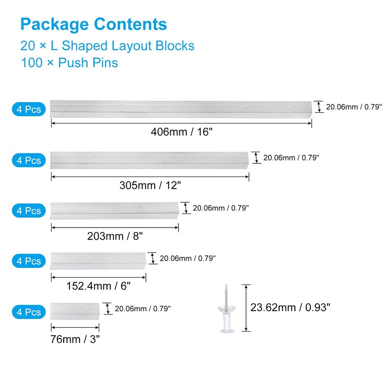 - Color: Silver; Material: Plastic/ Aluminum Alloy; Thumbtacks Size (L/ W): 23.62mm/ 0.93 inch, 8.63mm/ 0.34 inch; NeedleSize(length/ diameter): 11.17mm/ 0.44inch, 1.01/ 0.04inch; Layout Blocks System Length: 406mm/16 inch; 305mm/12 inch; 203mm/8inch; 152.4 mm/6 inch; 76mm/3inch; Layout Blocks System Width: 20.06mm/ 0.79 inch; Layout Blocks System Thickness: 1.01mm/ 0.04 inch; Aperture: 1.78mm/ 0.07 inch; Packing List: 4pcs L shaped layout block, 100pcs push pins.
