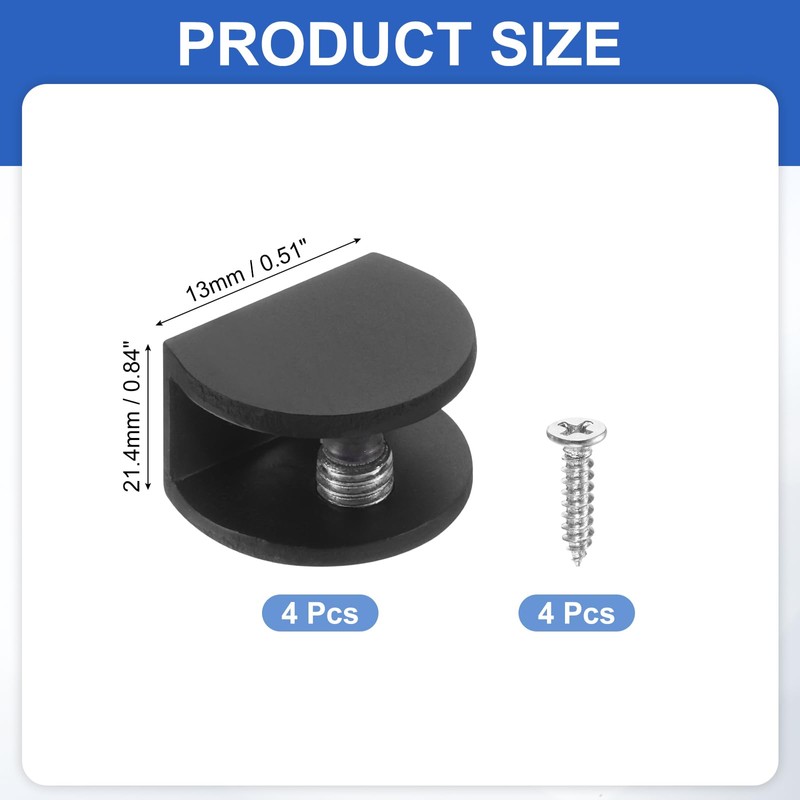 - Color: Black; Material: Aluminum Alloy; Suitable for: 6-8mm thick; Size: 21.4 x 13 x 2 mm / 0.84 x 0.51 x 0.08 inch (L*W*T); Packaging List: 4 Pcs x Shower Glass Clamp Clip; 1 Pcs x Rivet; 1 Pcs x Screw