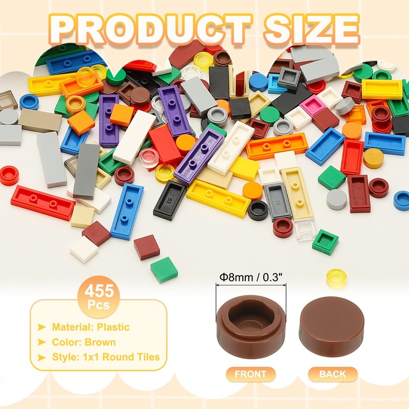 - Specifications: Color: Brown; Material: Plastic; Diameter: 8mm / 0.3 inch; Style: 1x1 Round Tiles; Packing Listing: 455 x Building Tiles