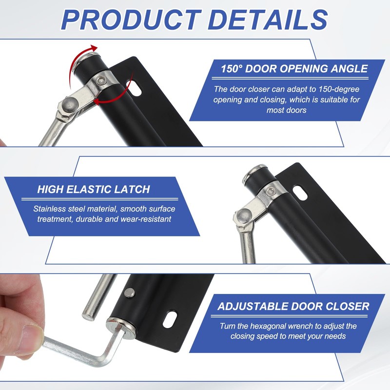 - Advantages: The spring door closer converts a hinged door into an automatic closing door, providing convenience for users who do not have to close the door manually every time. The closing arm can swing 150°, which is suitable for a variety of doors. The door closer can be easily adjusted, which is convenient for controlling the closing speed and protecting the door lock