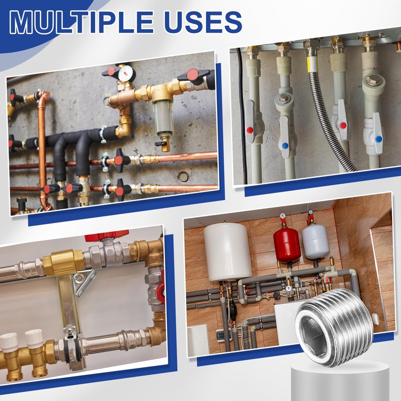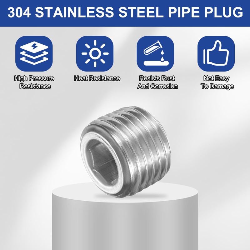 - Advantage: The hexagon socket pipe plug is made of durable 304 stainless steel material with a silvery white finish, corrosion-resistant and rust-proof, and can withstand frequent use. This stainless steel pipe plug fitting features a countersunk head design, smooth and burr-free, and clear threads to ensure a secure and tight fit.