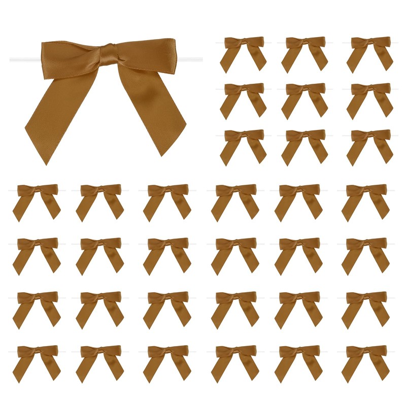 - We provide 50pcs Brass bows with twist ties, which size: 89 x 89 mm/ 3.5 x 3.5 inch (L*W); Ribbon Width: 25 mm/ 1 inch; Clear Twist Tie Length: 12.7 cm / 5 inch