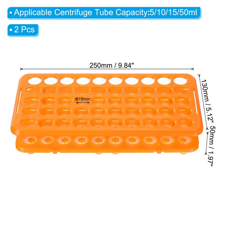 - Specification: Size: 250x130x50mm/9.84x5.12x1.97 inch; Wells Quantity: 50; Wells Diameter:18mm; Applicable Centrifuge Tube Capacity:5/10/15ml; Material:ABS; Color: Orange; Packing List: 2 Pcs Tube Rack; Matching quantity of brackets