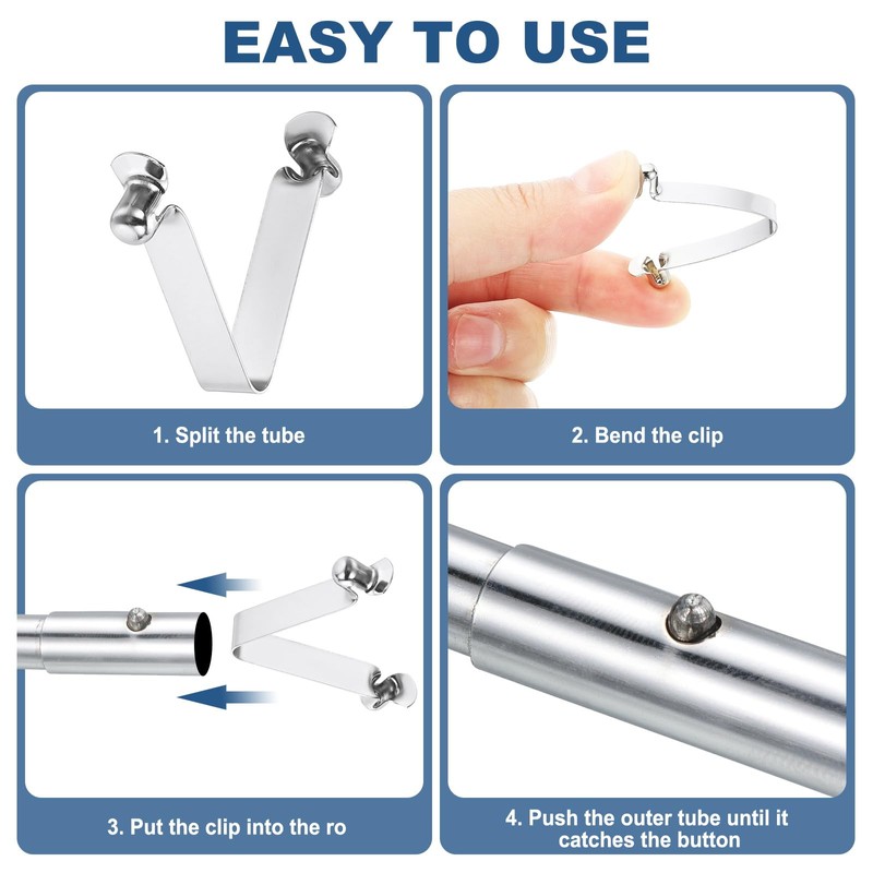 - Instruction: Bend the clip, put the clip into the rod, snap the button clip into the hole, and push the outer tube until it catches the button.