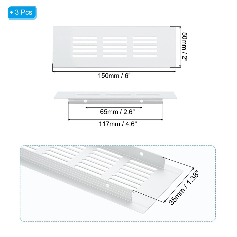 - Specification: Cover Size: 150 x 50 x 9 mm / 6 x 2 x 0.35 inch(L*W*H); Inner Diameter Size: 117 x 35 mm / 4.6 x 1.4 inch(L*W); Installation Hole Distance: 65 mm / 2.6 inch; Material: Aluminum Alloy; Color: Silver; Package Content: 3 x Vents Cover, 12 x Screws.