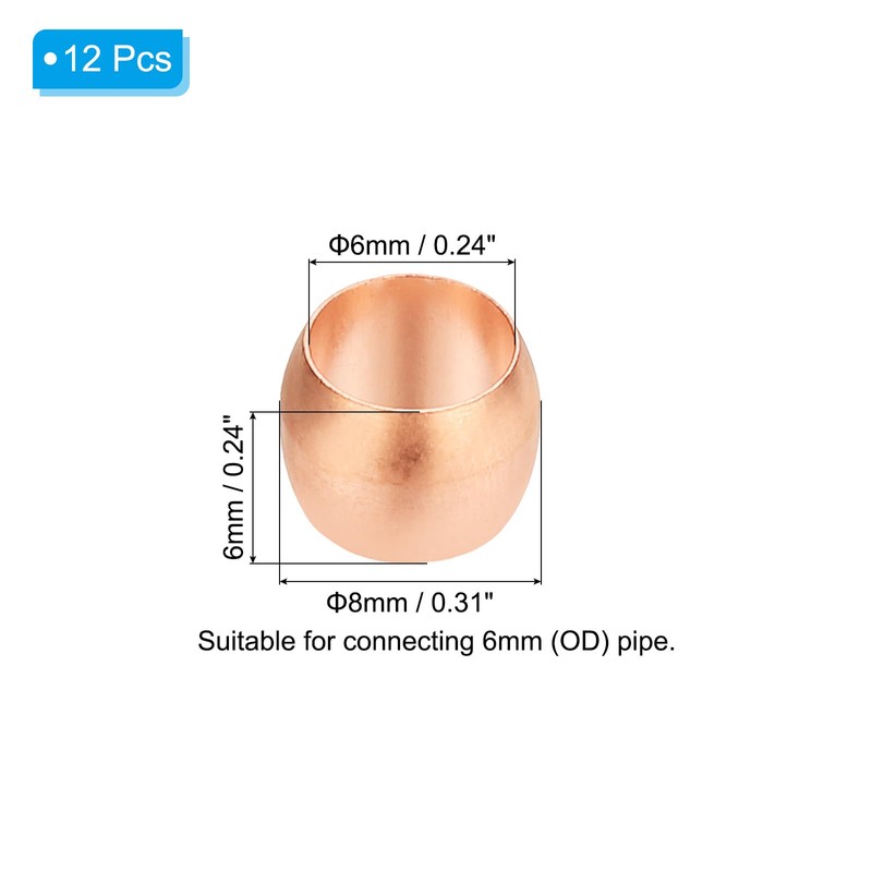 - Specification: Material: Copper; Color: Copper Tone; Total Length: 6mm / 0.24inch; Suitable for connecting 6mm outer diameter copper pipe.; Inner Diameter: 6mm / 0.24inch; Outer Diameter: 8mm / 0.31inch; Wall Thickness: 1.2mm / 0.05inch; Package List: 12 x Compression Sleeves Ferrules