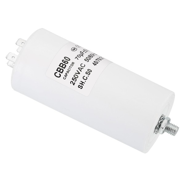 - Model: CBB60; Material: Polypropylene Film Plastic Shell; Lead End: 4 pins; Tolerance: ±5%; Rated Capacity: 70uf ; Climatic Category: 40/70/21; Body Size: 50 x 109mm/1.95 x 4.25inch(D x H);Screw Size:M8x1.25x14mm ; Pack of 1Pcs Run Capacitor