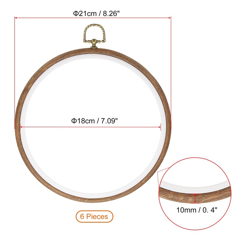 Inner Diameter: 18cm / 7.09inch - Advantage: Our cross stitch hoop frame is made of rubber plastic, durable and flexible, with good compression resistance, the outer resin hoop has good elasticity and can be easily twisted into an "8" shape to return to its original shape. Retro brass hanging ring with wood grain makes handcrafts more exquisite, anti-skid texture offers a comfortable grip. This embroidered hoop frame features vintage wood grain to add more charm to your embroidery creations.