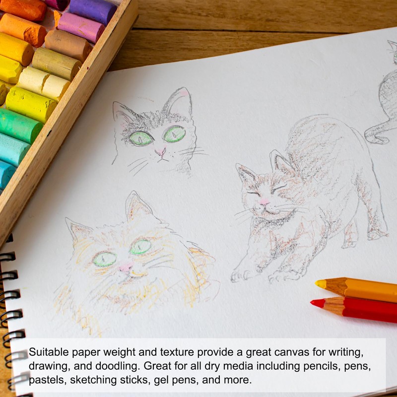 - Advantage: The spiral binding makes it easier to turn pages, and the bottom hard cover design allows you to start drawing anytime and anywhere without a drawing board; Suitable paper weight and texture provide a great canvas for writing, drawing, and doodling; This sketch paper pad is extremely tough and durable and can be erased without damaging the paper surface.