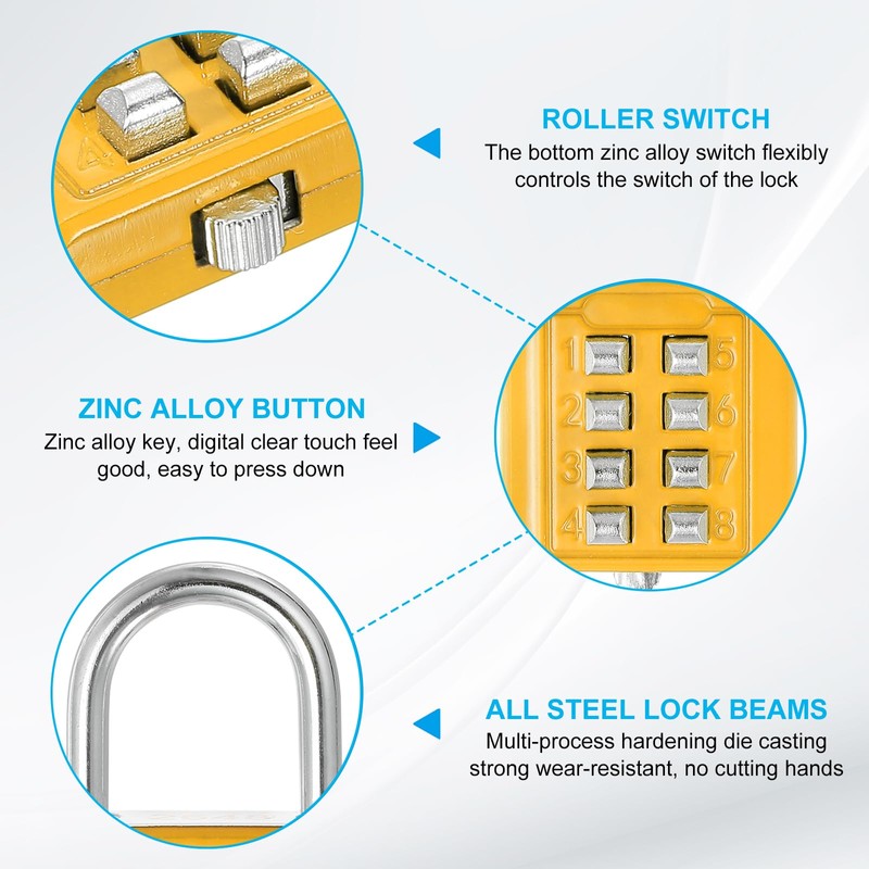 • Advantage The combination lock is made of zinc alloy and alloy steel, with good corrosion resistance and rust resistance, wear resistance and durability. The numbers on the lock are clear and the buttons are flexible, easy to use and very suitable for blind elderly.