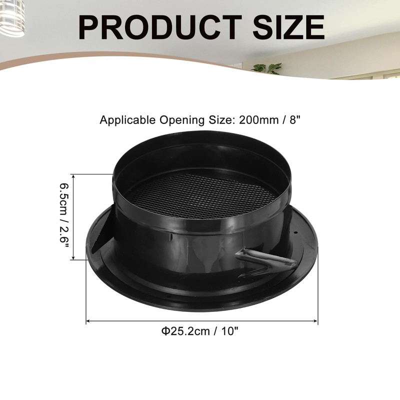 - Opening Dia.: 200mm / 8 inch; Compatible for 8 inch duct or wall hole and the ceiling hole; Packing List: 1 Pcs x Soffit Vents