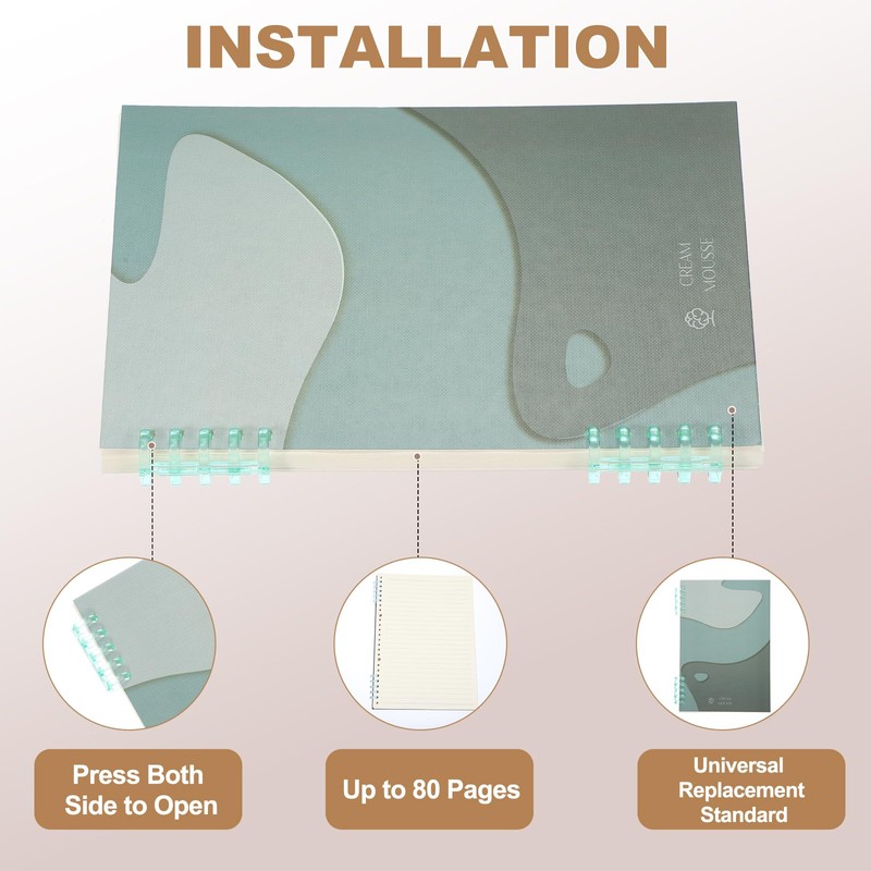 - Advantage: This refillable notebook is designed with a double five-ring binder that allows you to freely fill or reduce the amount of paper, easily opening the binder to take out a particular sheet without damaging the paper. Each notebook includes 60 sheets of double-sided paper and supports up to 80 pages of A5-sized replacement cores.