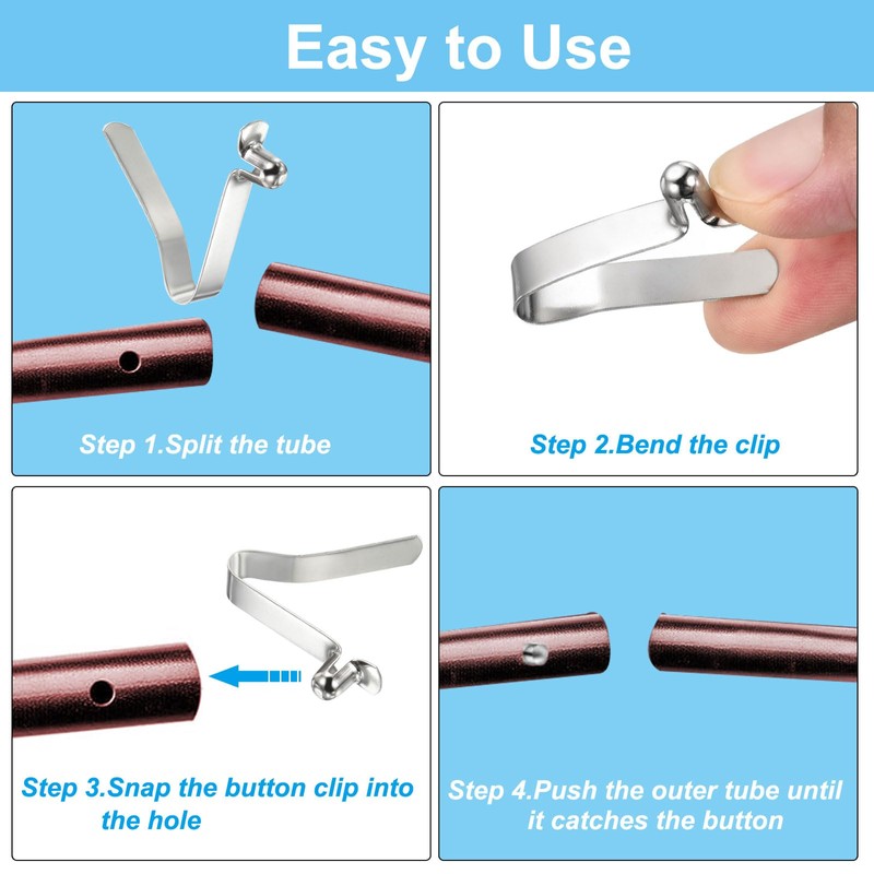 - Instruction: Bend the clip, put the clip into the rod, snap the button clip into the hole, and push the outer tube until it catches the button.