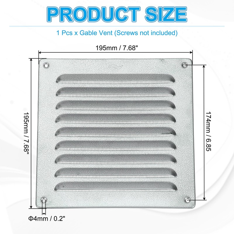 - Material: Aluminum; Total Size: 195x195mm / 8x8 inch; Installation Hole Distance: 174mm / 6.85 inch; Mounting Hole Dia: 4mm; Packing Listing: 1 x Gable Vent (Screws not included)
