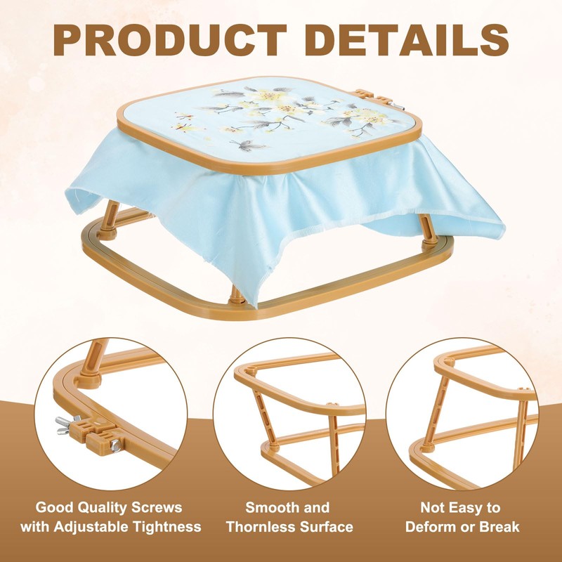 We provide 2 different sizes of square plastic embroidery frames, 4 support rods (12cm/4.7inch), 2 butterfly nuts, and 2 screws to form a tabletop embroidery stand. The size of the bottom embroidery frame is 32x28cm/12.6x11in, and the upper embroidery frame is 24x22cm/9.4x8.7in. You can have enough retro embroidery hoops to make beautiful handmade crafts to decorate your house.
