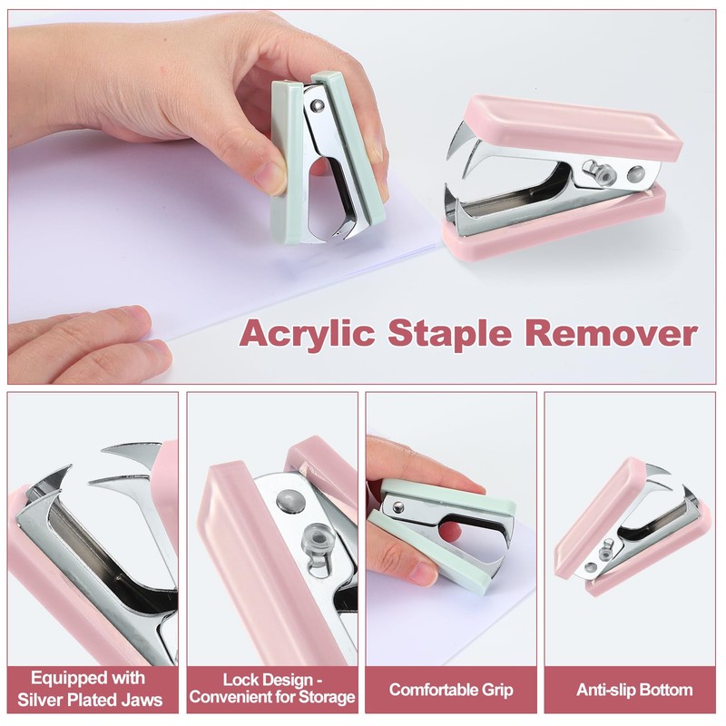 - Advantage: Crafted from sturdy acrylic, this mini staple remover is durable, light, compact, smooth surface not easy to hurt your hand. Metal jaw is not easy to deform, wear, and fade, and can serve you for a long time. Equipped with silver-plated jaws, the staple remover effortlessly and neatly handles the most stubborn staples without damaging precious documents. Suitable for removing most staples. Lock design allows you to lock the remover when not in use which is easy to store.