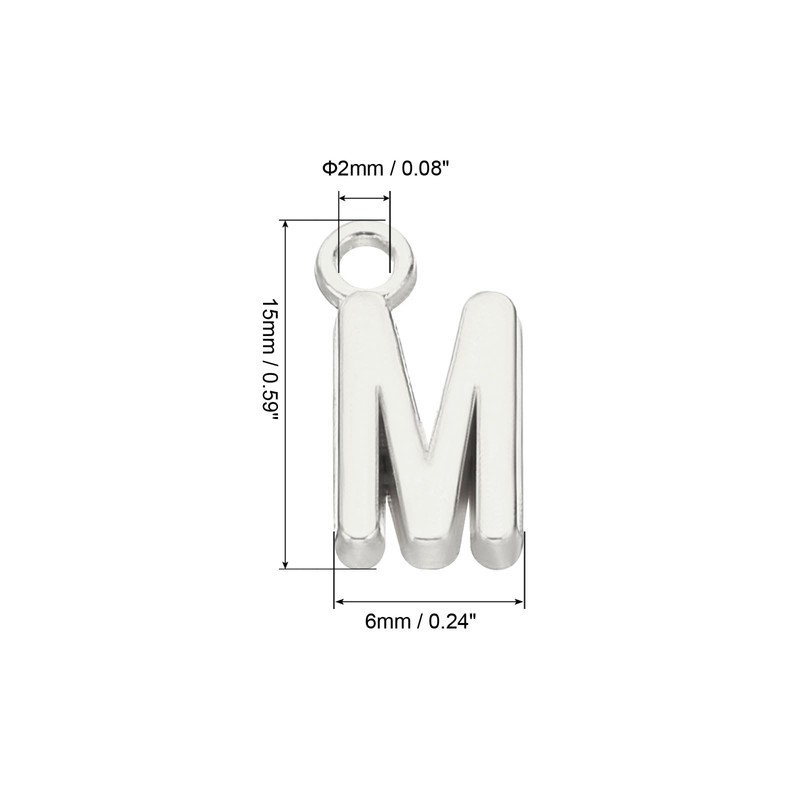 - Alphabet Charm Color: Silver Tone; Material: Alloy; Hanging Hole Diameter: 2 mm / 0.08 inch; Size: 15 x 6 mm / 0.59 x 0.24 inch(L*W); Packing List: 50 x Metal Letter Drops Charm