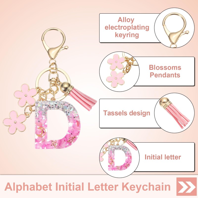 - Advantage: This cute letter keychain comes with tassels and flower pendants and is made of epoxy resin material, which is hard and does not deform. The keyring is made of alloy electroplating, with a unique initial design and sequins, which are gorgeous and beautiful