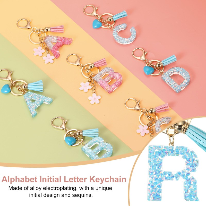 - Advantage: This cute letter keychain comes with tassels and flower pendants and is made of epoxy resin material, which is hard and does not deform. The keyring is made of alloy electroplating, with a unique initial design and sequins, which are gorgeous and beautiful