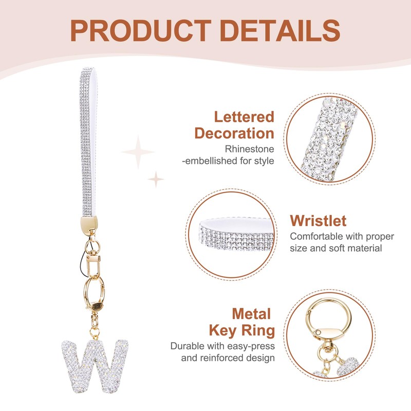 - Advantage: The letter decorated with rhinestones shines brightly, enhancing your style. The wristlet, with the right size and soft material, comfortably frees your hands. The metal key ring, with an easy-to-press mechanism and reinforced for durability to keep the rhinestones intact, combines beauty and function.