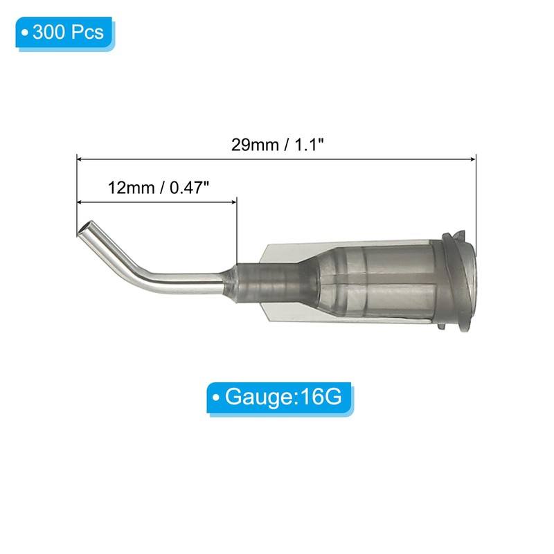 - Packing List: 300pcs 12mm / 0.5 inches 16G elbow dispenser needles, total length: 30mm / 1.2 inches.