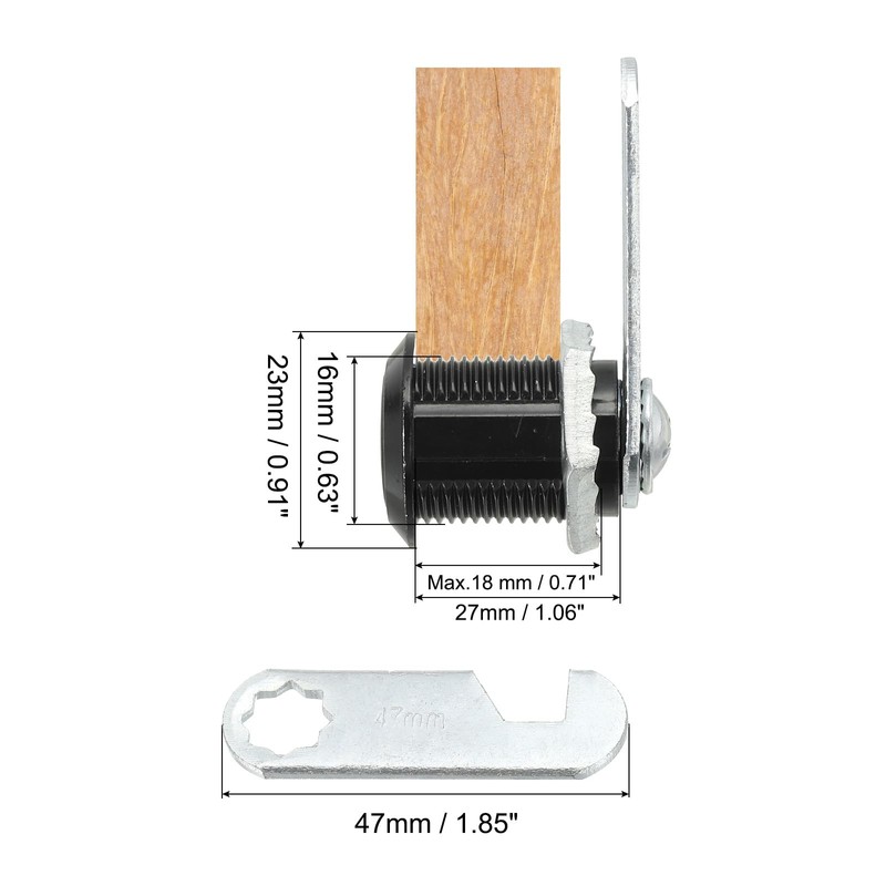 - Mounting Hole Diameter: 18 mm / 0.70 inch; Fits on Max Panel Thickness: 27 mm / 1.06 inch; Cylinder Section: 18 x 16mm / 0.71" x 0.63" (LxW); Lock Tongue: 47 mm / 1.85 inch; Packing List: 4 x Drawer Lock with Keys