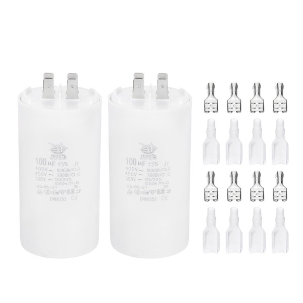 - Specification: Model: CBB60; Material: Polypropylene Film Plastic Shell; Lead End: 4 Pins; Tolerance: ±5%; Rated Capacity: 100uF; Climatic Category: -25/85/21; Pack of 2 Pcs Run Capacitor, Each capacitor is paired with four Sheath Spring