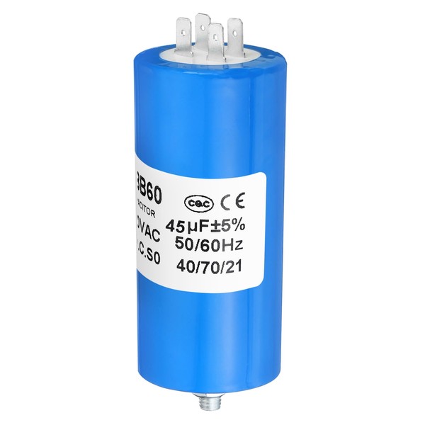 - Model: CBB60;Material: Polypropylene Film Plastic Shell;Lead End: 4 pins;Tolerance: ±5%;Rated Capacity: 45uf ;Climatic Category: 40/70/21; Body Size: 106 x 50mm/4.13 x 1.95inch (H x W) ; Pack of 1PcsRun Capacitor
