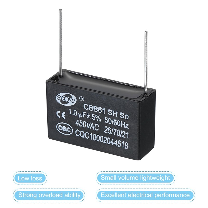 - Specification: Model: CBB61; Material: Polypropylene Film Plastic Shell; Terminal: 2pins; Tolerance: ±5%; Rated Capacity: 1uF; Climatic Category: 25/70/21; Body Size:36 x 12 x 22mm/1.4 x 0.47 x 0.86inch(L x W x H); Shell Color: Black; Rated Voltage: 450V AC; Rated Frequency:50/60Hz; Pack of 5Pcs CBB61 Capacitor