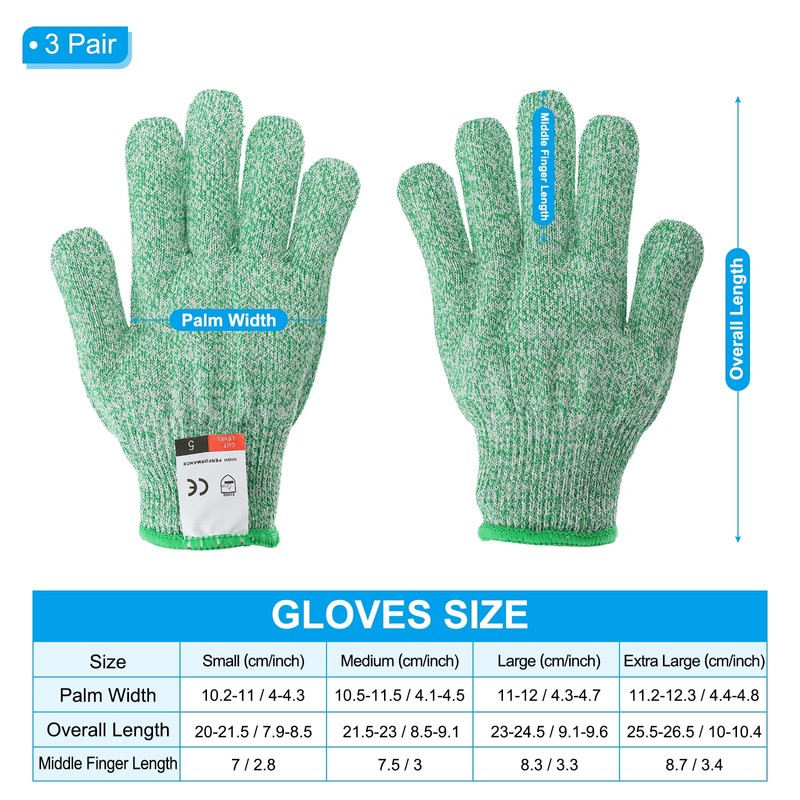 - Color: Green; Palm Width: 11cm / 4.3 inch; Overall Length: 23cm / 9.1 inch; Middle Finger Length: 8cm / 3.1 inch; Package List: 3 pair x Anti Cutting Gloves