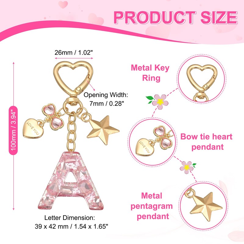 - Color: Pink; Style: Letter A;Total Length: 100 mm / 3.94 inch; Letter Dimension: 39 x 42 mm / 1.54 x 1.65 inches (L*W); Keychain Opening Width: 7 mm / 0.28 inch; Package List: 1 Pcs x Cute Initial Letter Keychain
