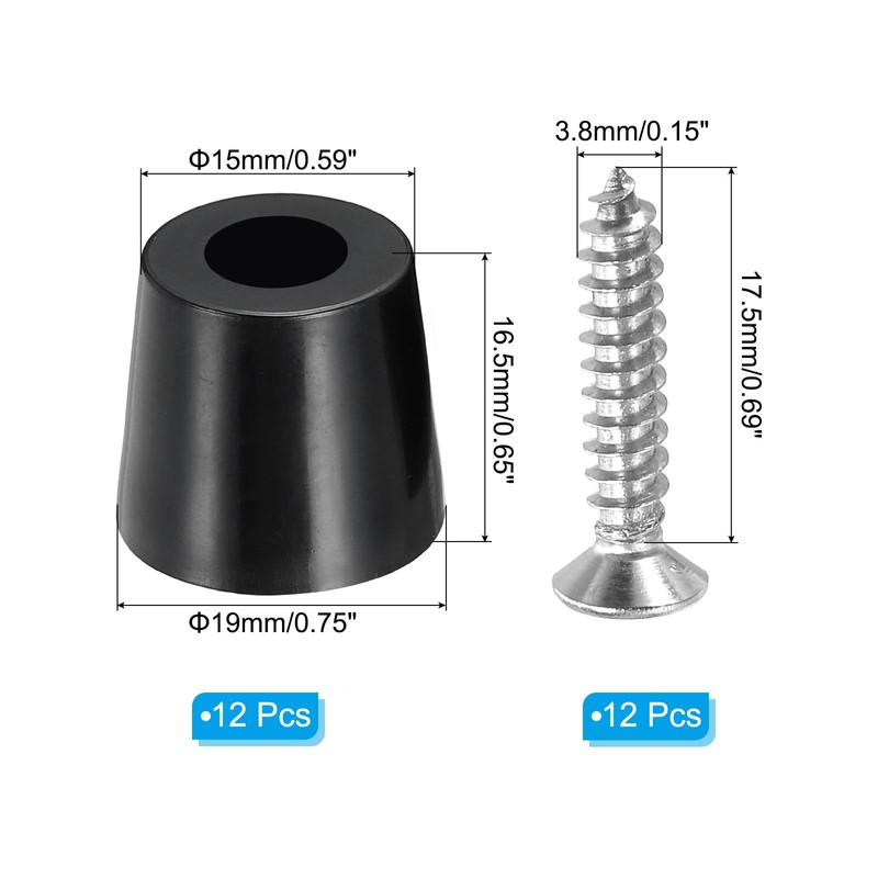 - Overall Size: 19 x 15 x 17mm / 0.59 x 0.19 x 0.67 inch (Top W*Bottom W*H); Hole Dia: 7.4mm / 0.29 inch; Screw Size: M4*13.2mm; Packing List: 12 x Cutting Board Feet; 12 x Matching Screws