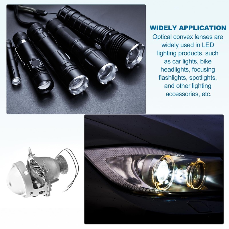 - Application: Optical plano-convex lenses are widely used in LED lighting products, such as car lights, bicycle headlights, focusing flashlights, spotlights, stage lights, projection lights, downlights, condensers, optical devices, floodlights and other lighting accessories. Can be used with a variety of high-power LED products, such as 1W, 3W, 5W, 8W, 10W 15W 20W, 50W, etc.