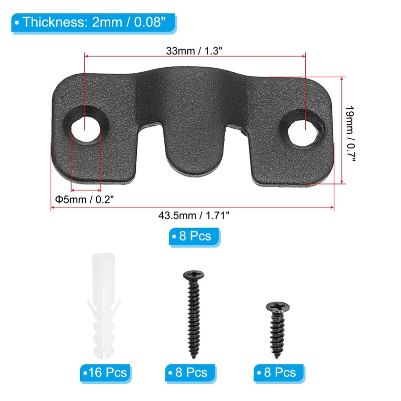 - Material: Stainless Steel; Total Size: 43.5x19mm/1.71x0.75inch(L*W); Thickness: 2mm/0.08inch; Hole Diameter: 5mm/0.2inch; Hole Distance: 33mm/1.3inch; Package List: 4 Pairs x Flush Mount Bracket (with 8 Plastic Covers, 4 Long Screw, 4 Short Screw)