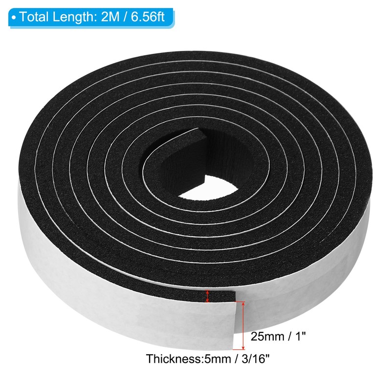 • Material: Foam; Color: Black; Total Length: 2M / 6.56ft; Width: 25mm / 0.98 inch; Thickness:5mm / 0.2 inch; Package List: 1 Roll x Weather Stripping