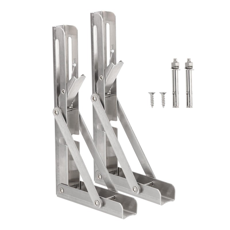 - Advantage: The Folding shelf bracket is made of Stainless Steel which ensures durability and hard-wearing. It resists daily scratches, corrosion, and tarnishing and meets aesthetic needs. The foldable shelf adopts the triangle structure, holding great weights up to 220 lbs per pair.
