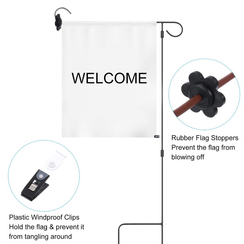 The rubber flag stoppers can prevent the flag from blowing off, the plastic anti-wind clips will securely hold the corners of your garden flag and prevent it from tangling around.