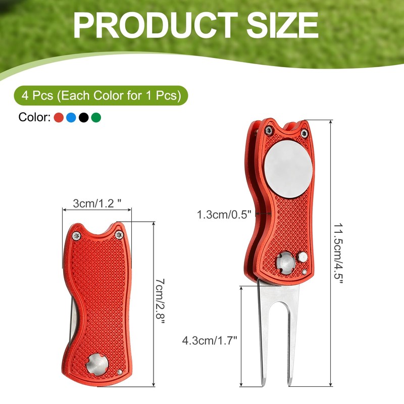 - Color: Green/Blue/Red/Black; Material: Aluminum Alloy, Stainless Steel; Expanded Size: 11.5 x 3 x 1.3cm / 4.5 x 1.2 x 0.5 inch (L*W*T); Packing List: 4Pcs x Golf Divot Tool