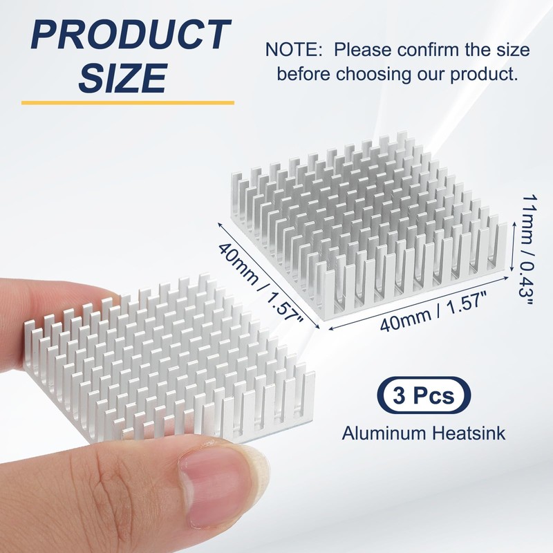 - Color: White; Material: Aluminum; Size: 40 x 40 x 11 mm/ 1.57 x 1.57 x 0.43 Inch (L*W*T); Packing List: 3 Pcs x Aluminum Heatsink (NOTE: Please confirm the size before choosing our product)