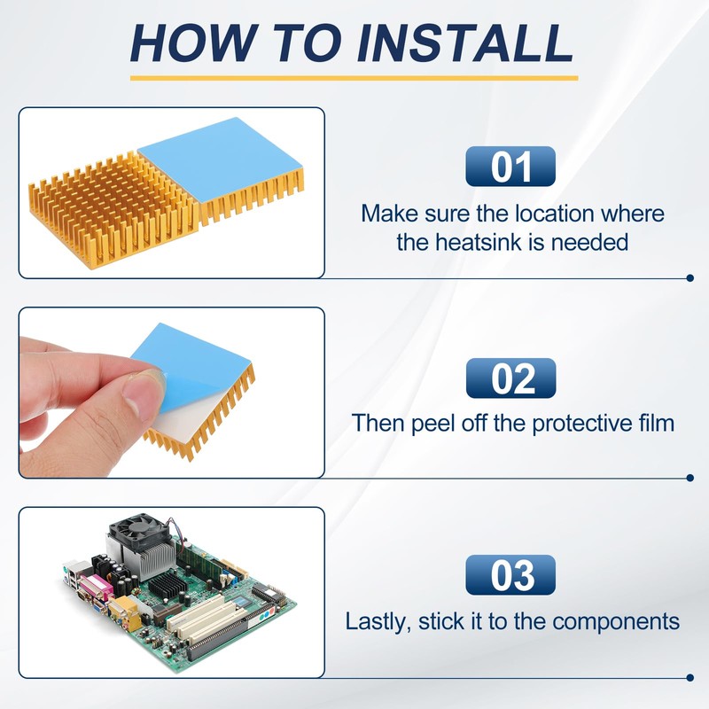 • Instruction: 1. Make sure the location where the heatsink is needed. 2. Then peel off the protective film. 3. Lastly, stick it to the components