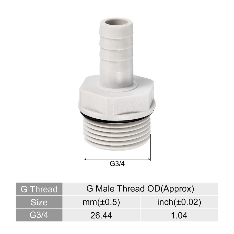 - Color: Grey; Fitting Shape: Straight; Material: POM Plastic; Thread Size: G3/4 Male; Thread Length: 12mm / 0.47 inch; Barb Outer Diameter: 13mm / 0.51 inch; Overall Size: 47mm x 26.5mm / 1.85 inch x 1.04 inch (L*Hex. W).