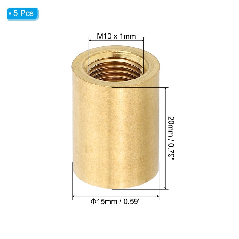 PATIKIL Lamp Pipe Brass Coupling Nut, 5 Pcs 20mm Long M10 Fine Round Thread Sleeve Lamp Pipe Adaptor Rod Connector Hardware for Light Fixture Assembly or Repair, 15mm OD.