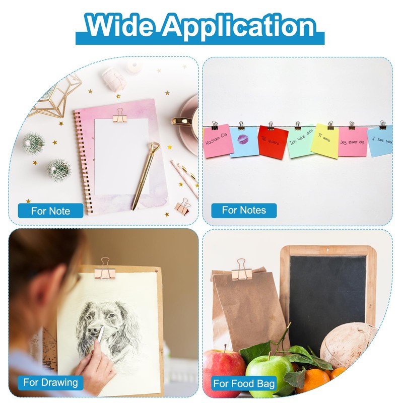 - Application: our binder clips are suitable for clamping papers, notes, photos, files, tickets, food bags, etc. in the home, kitchen or office. They can effectively help you organize documents and seal bags to keep your home tidy.