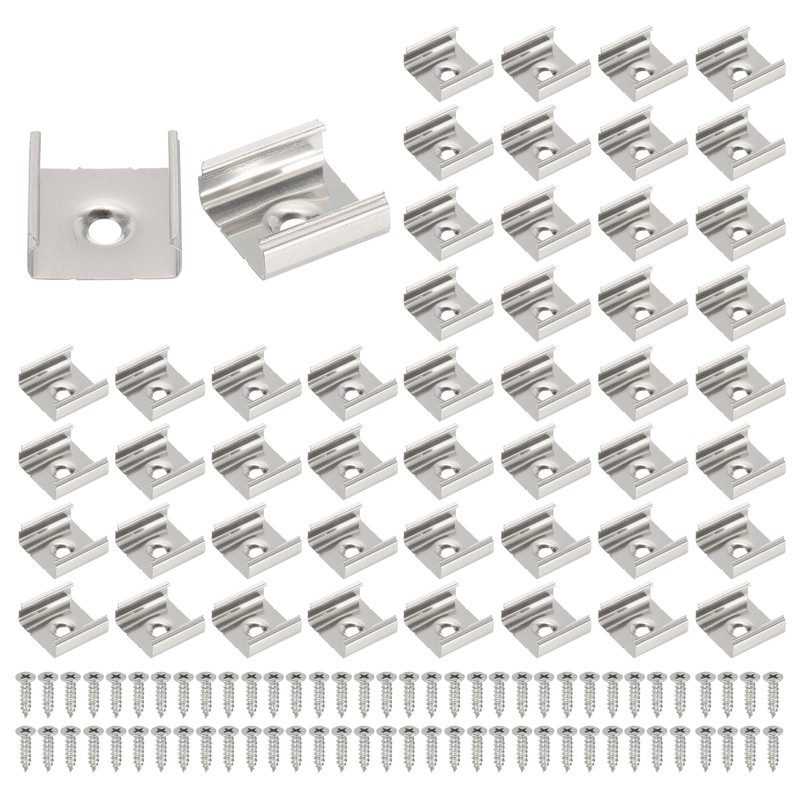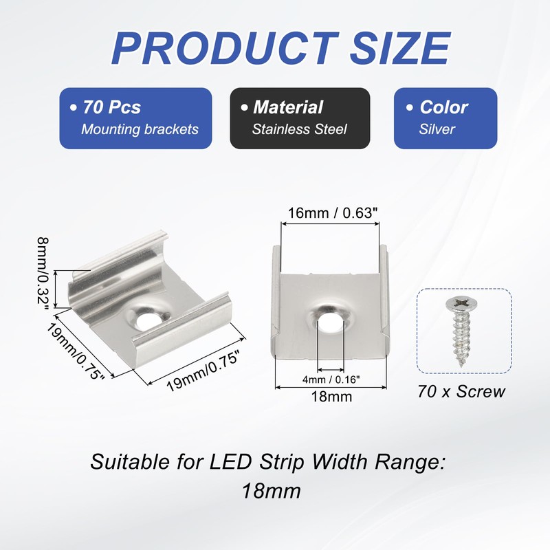- Colour: silver; material: stainless steel; total size: 19 mm x 19 mm x 8 mm / 0.75 x 0.75 x 0.32 inches; inner width: 16 mm/0.63 inches; suitable for LED strip width: 18 mm; mounting hole diameter: 4 mm/0.16 inches; box contents: 70 pieces LED strip light clips, 70 pieces screws