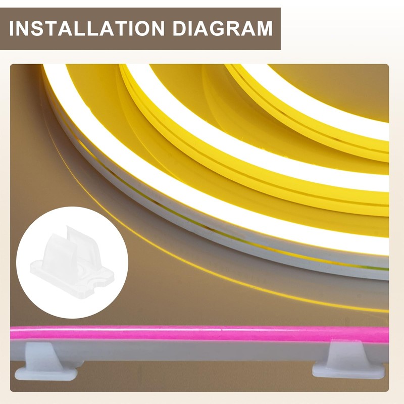 - Instruction: First, fix the buckle with screws or glue. Then, push the light strip to one side first(The glue needs to be dry before installing the buckle). Push one side in, and press the other side down. Finally, the installation is complete. Per meter of the strip should be fixed with 2-4 buckles.
