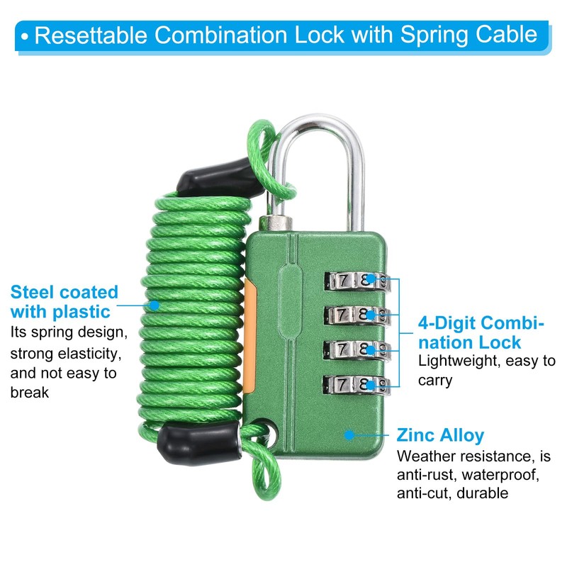 - Advantage: The padlock is made of zinc alloy material, has good weather resistance, is anti-rust, waterproof, anti-cut, durable, and does not easy to fade after long-term use. The strong plastic-coated steel cable can resist rust and scratches. 4-digit combination lock, the password wheel is smooth and not locked. It can provide 10,000 groups of passwords to choose from, with high security and strong anti-theft performance. Keyless design, small size, lightweight, easy to carry.