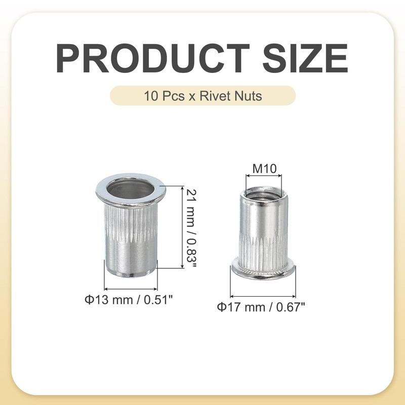 • Thread Size: M10; Cap Outer Diameter: 17 mm / 0.67 inch; Body Diameter: 13 mm / 0.51 inch; Height: 21 mm / 0.83 inch; Packing List: 10 x Rivet Nuts