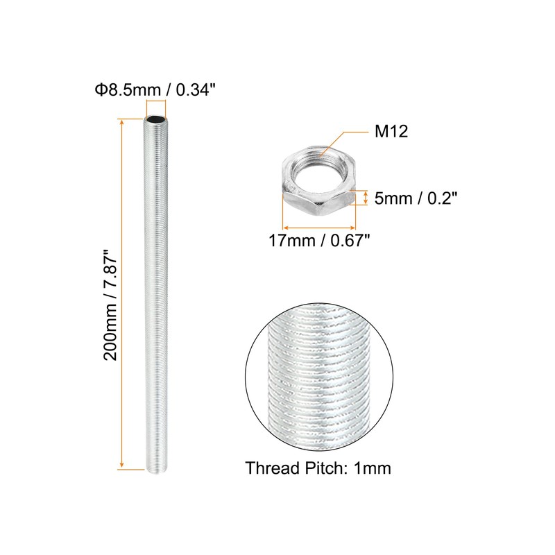 - Material: Carbon Steel, Surface Treatment: Zinc Plating, Thread Size: M12, Thread Pitch: 1mm, Lamp Pipe Size: 8.5mmx200mm / 0.34"x7.87"(ID*Length), Nut Size: 5mmx17mm / 0.2"x0.67"(T*W)