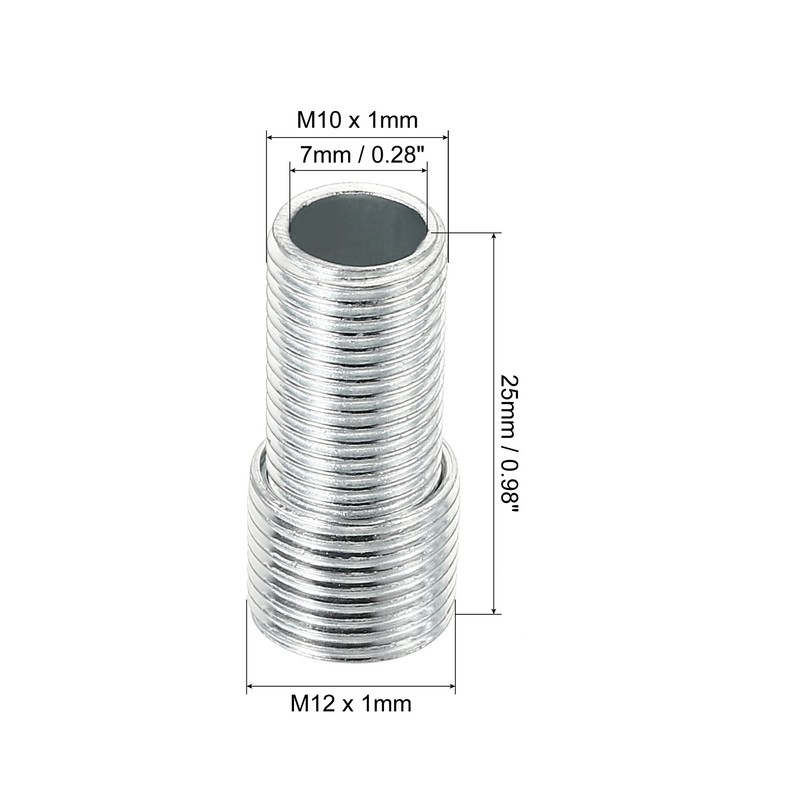 - Specification: Material: Carbon Steel; Bigger External Thread: M12; Smaller External Thread: M10; Thread Pitch: 1mm; Height: 25mm / 0.98 inch; Inner Diameter: 7mm / 0.28 inch